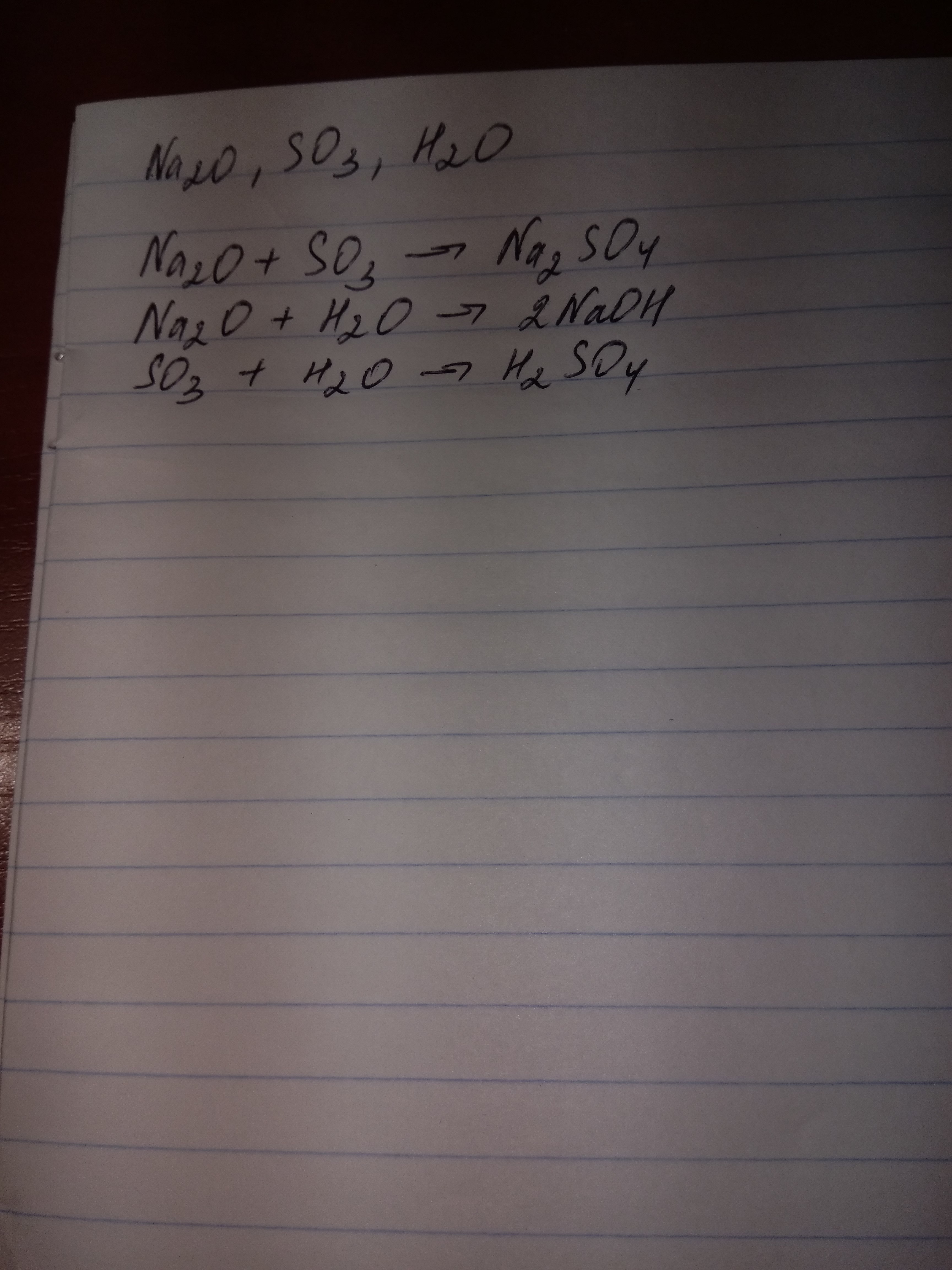 Даны вещества, формулы которых: Na2O, SO3, H2O. Составьте уравнения возможных реакций между ними