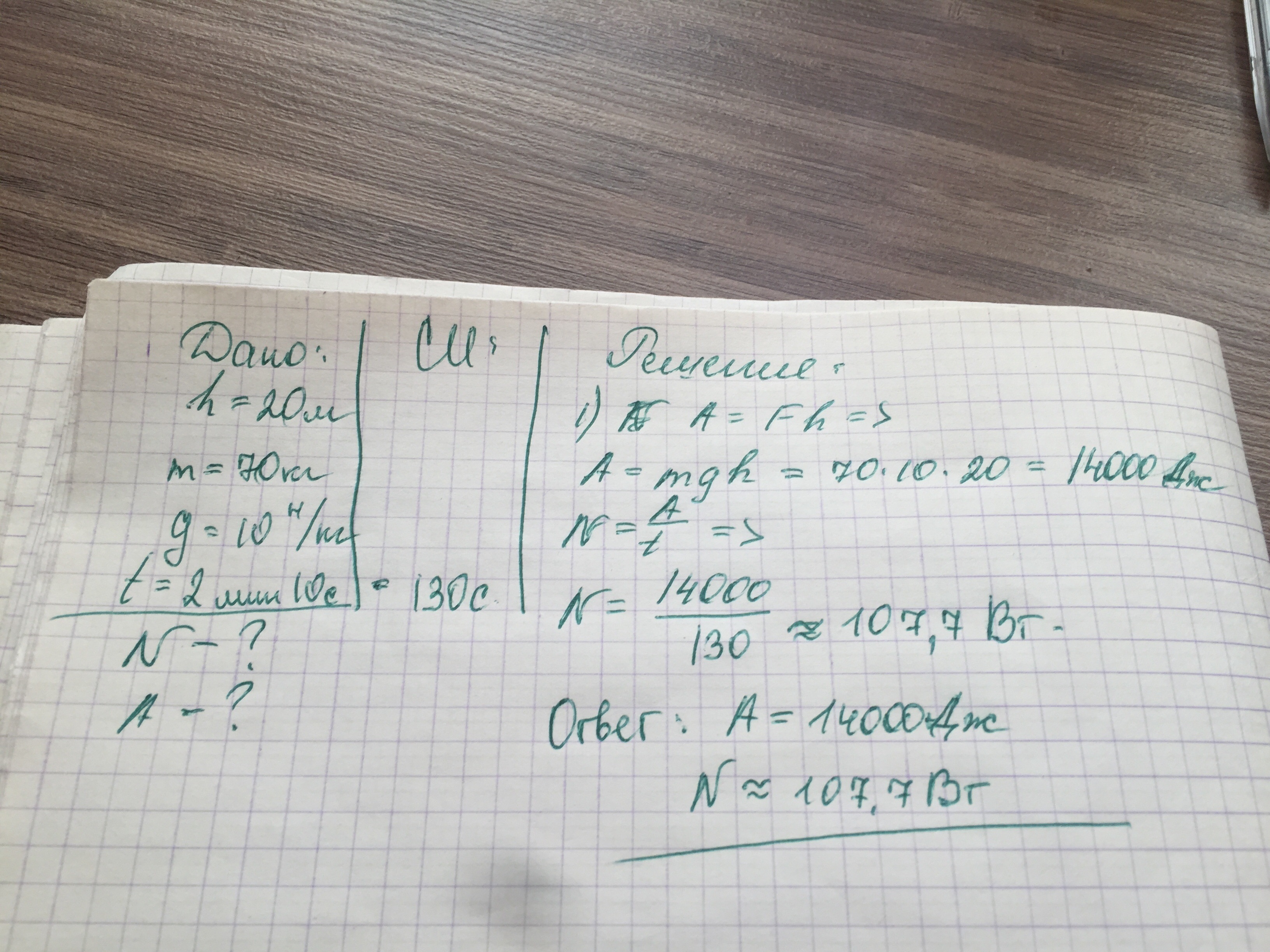 ПОМОГИТЕ ЩА КР БУИТ Рассчитать работу и мощность при подъеме по лестнице высотой 20 м, человека массой 70 кг.Время подъема 2 мин 10 с.