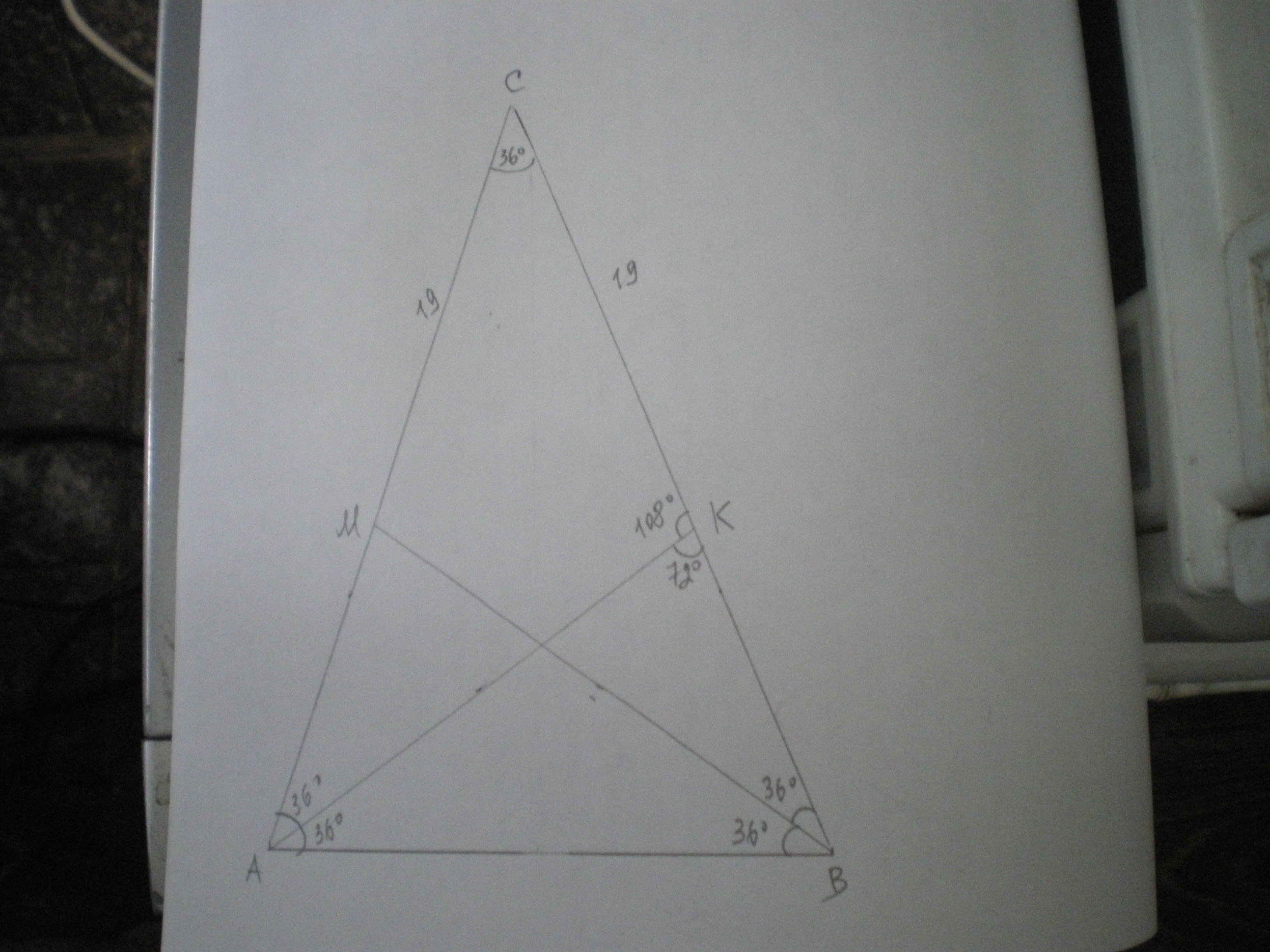 В равнобедренном треугольнике АВС угол при вершине С = 36*. ВМ и АК - биссектрисы углов В и А соответственно. Найдите длину АВ, если СМ+СК=38 см. Пожалуйста, с пояснением и чертежом.