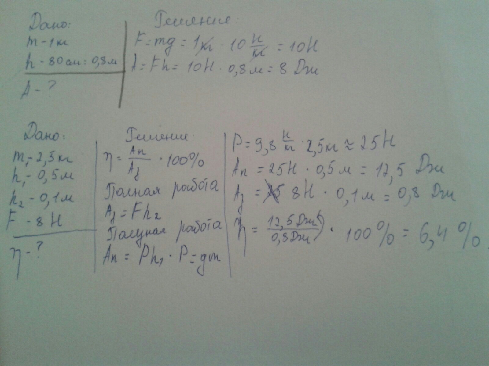 груз массой 2,5 кг. подняли по наклонной плоскости длинной 0,5 м. высотой 0,1 м. сила приложенная грузу 8 H. найти КПД.