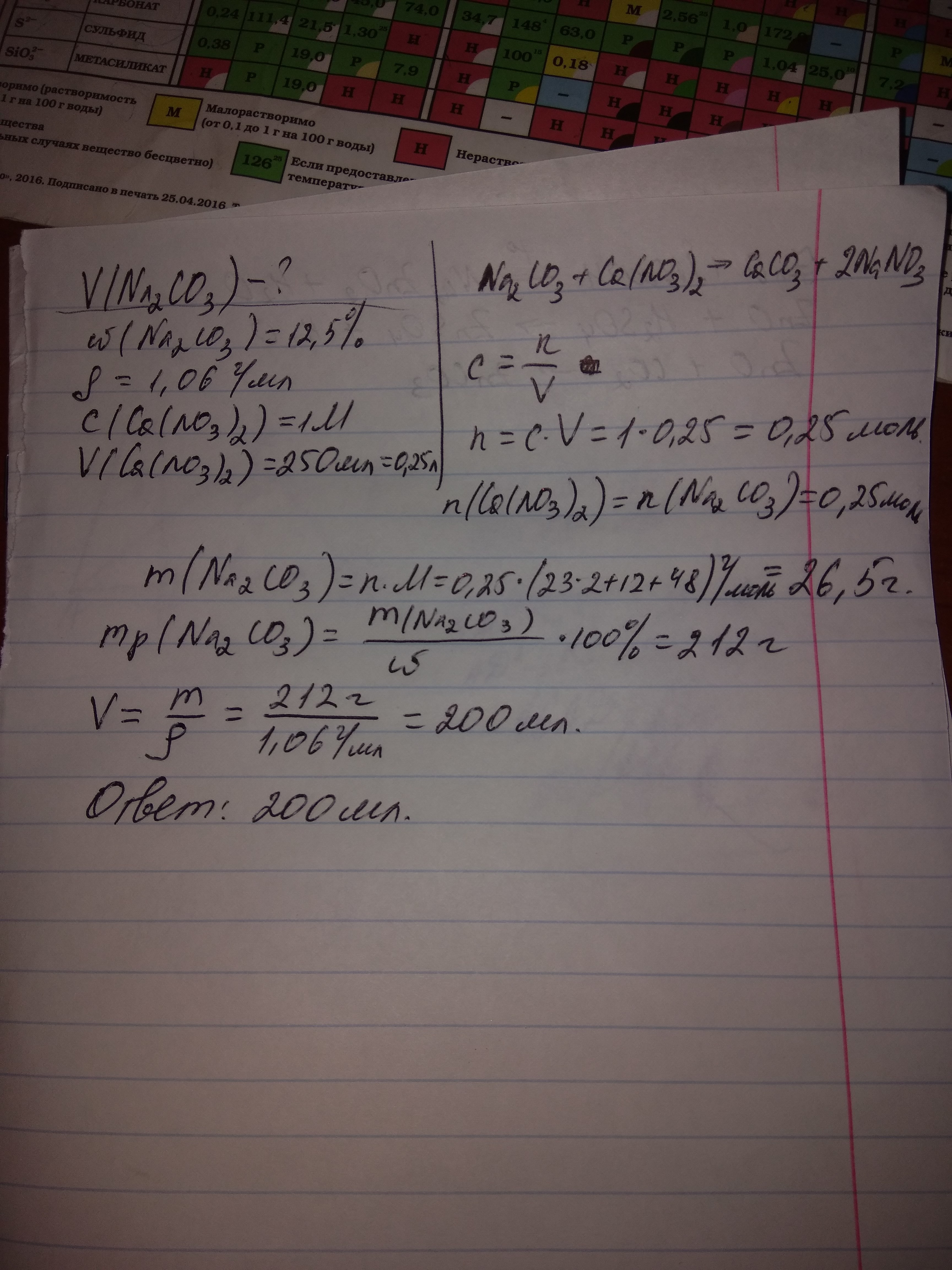 Какой объём раствора карбоната натрия с массовой долей Na2Co3 12,5% и плотностью 1,06 г/мл требуется для реакции обмена с 250 мл одномолярного раствора нитрата кальция?