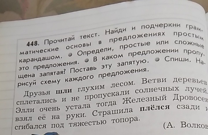 Друзья(подл., сущ) шли(ск.,глаг) глухим лесом. Ветви(подл., сущ) деревьев сплетались (ск., глаг) и не пропускали(ск., глаг) солнечных лучей. Элли(подл., сущ) очень устала(ск., глаг), тогда Железный Дровосек(подл., сущ) взял(ск., глаг) ее на руки. Страшила (подл., сущ) плелся (ск., глаг) сзади и сгибался(ск., глаг) под тяжестью топора.