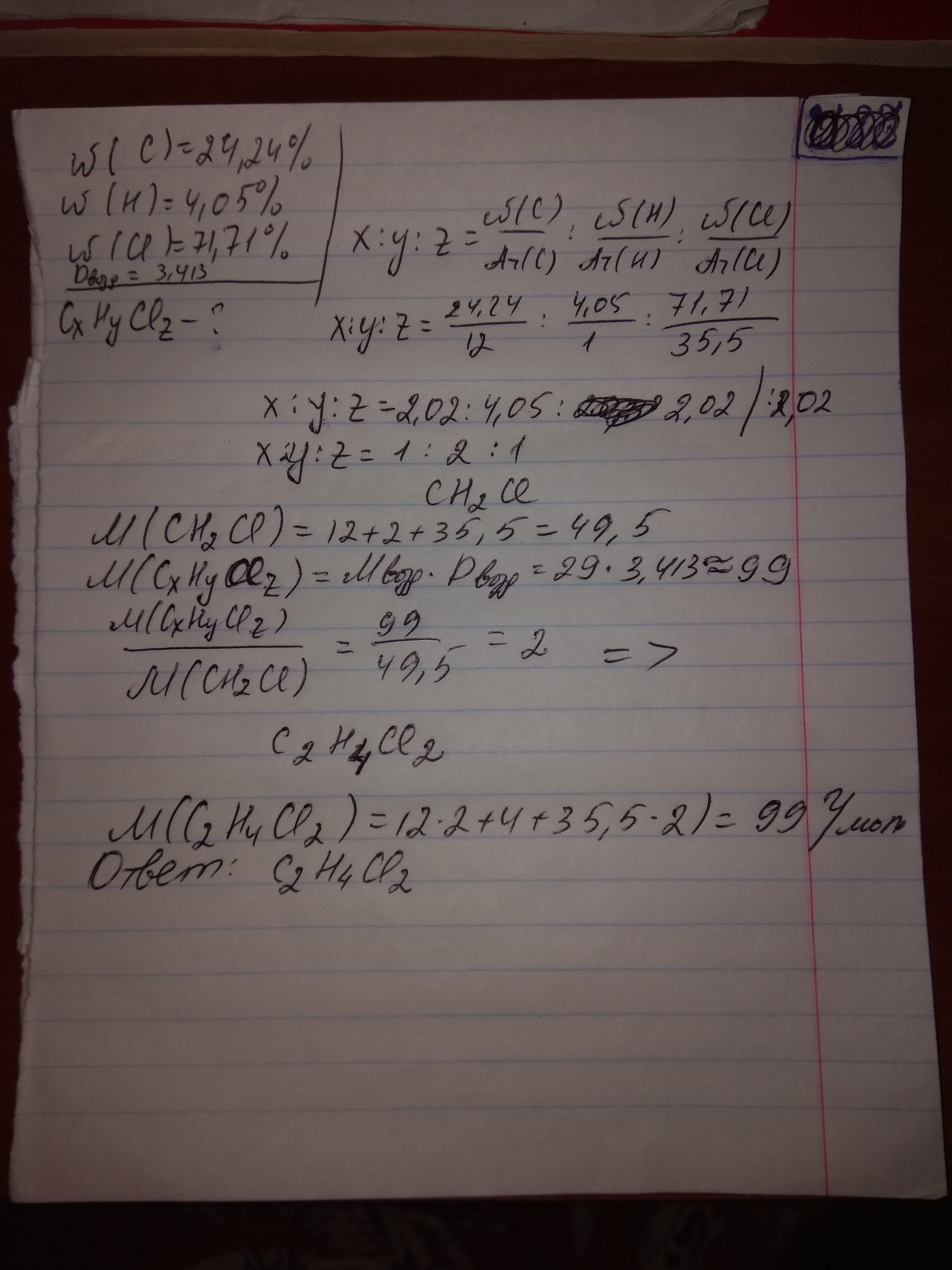 Определите формулу органического вещества,если в его молекуле имеется углерод (24,24%),водород (4,05%), и хлор(71,71%).Плотность по воздуху составляет 3,413.