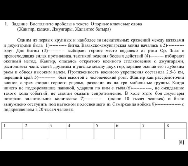 1) Орбулакская битва. 2) 1635 г. 3) Жангир 4) казахи 5) окопа 6) джунгары 7) воинов 8) Жалантос батыра