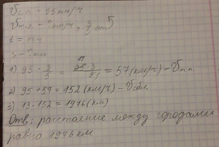 Из двух городов одновременно навстречу друг другу отправились скорый и товарный поезда.Они встретились через 13 часов.Определи расстояние между городами,если известно,что скорость скорого поезда 95км/ч,а товарного 3/5 от скорости скорого.