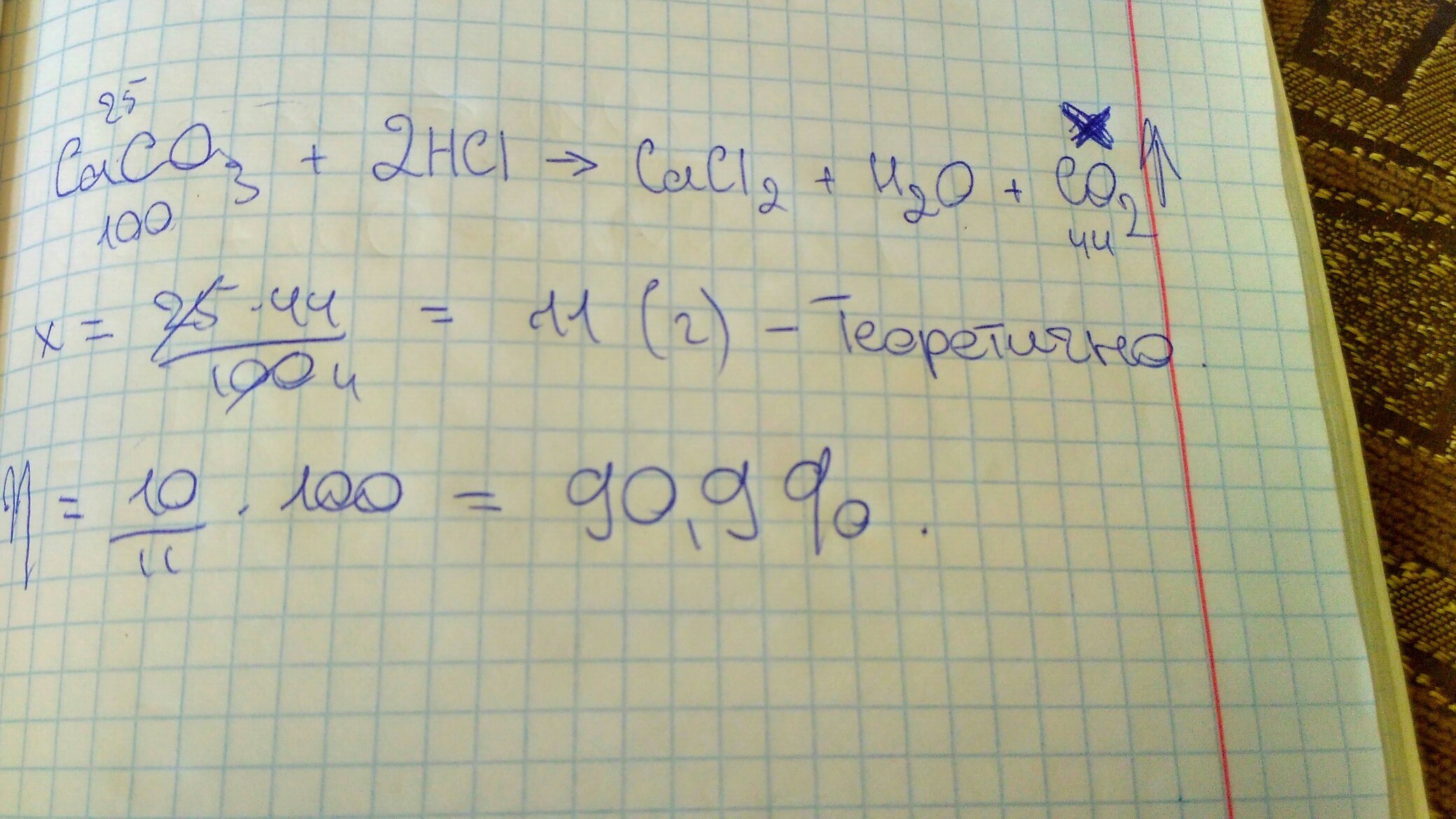 При дії надлишку хлоридов кислоти на карбонат кальцію масою 25 г добули диоксид вуглецю масою 10 г . Обчислити масову частку практичного виходу продукції