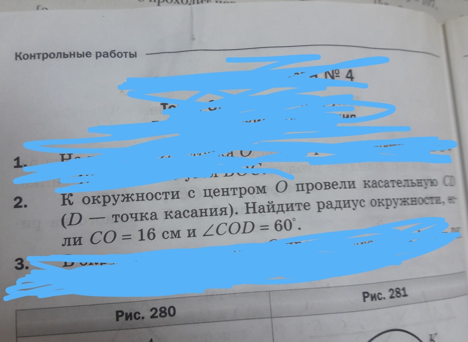 Очевидно COD - прямоугольный треугольник с прямым углом OCD. Так что получается мы знаем длину его гипотенузы OC = 16 и угол при гипотенузе 60 градусов. Радиус окружности совпадает с катетом OC и равен 16*cos(60) = 16/2 = 8