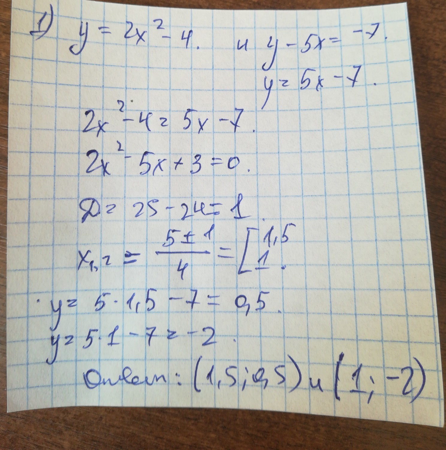 Не выполняя построения графика, найдите координаты точек пересечения параболы y=2x²-4 и прямой y-5x=-7