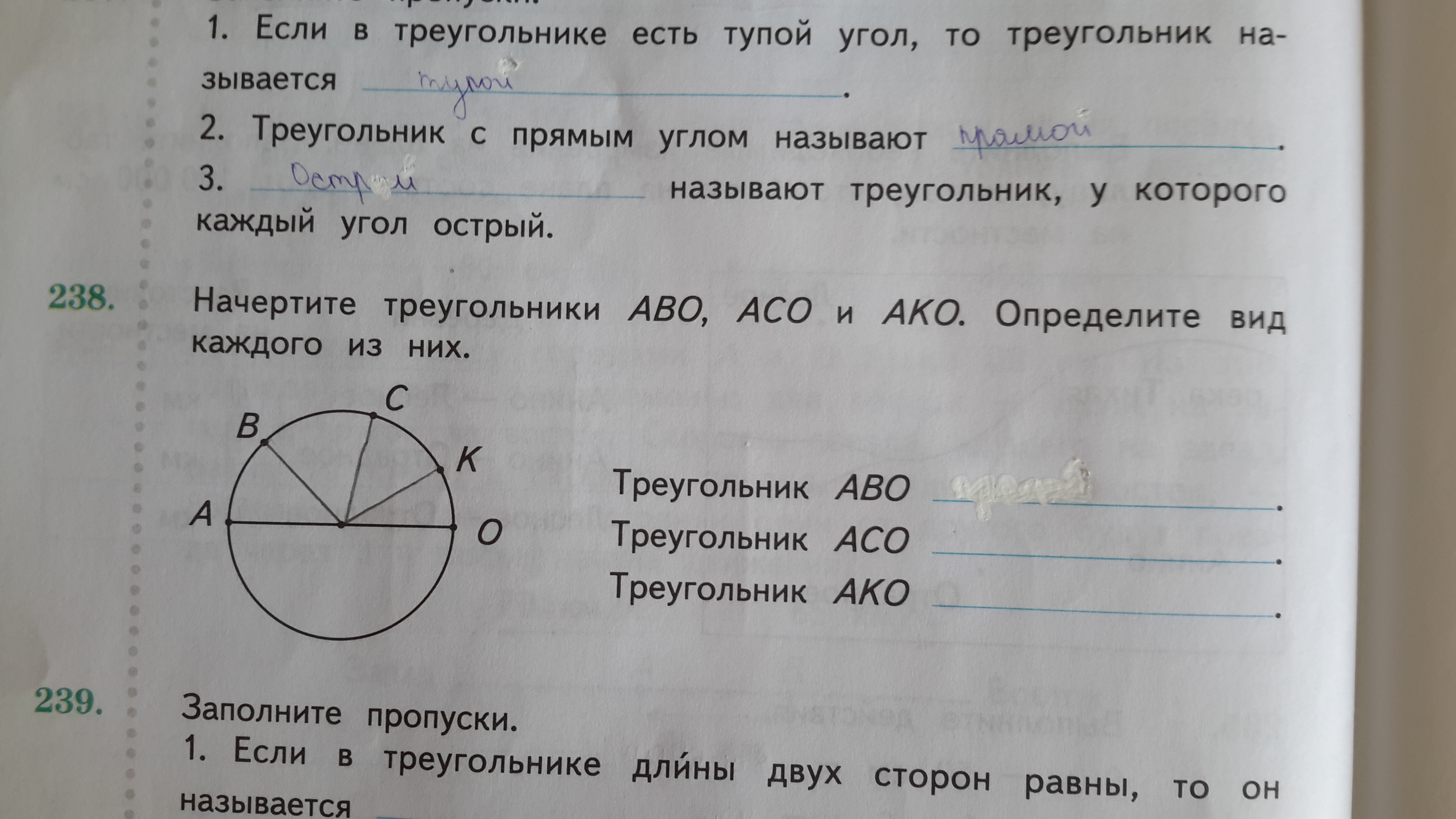 треугольник ABO прямоугольный,треугольник ACO тупоугольный, треугольник AKO остроугольный. И в 1 номере тупоугольный, во втором прямоугольный, а в третьем остроугольный