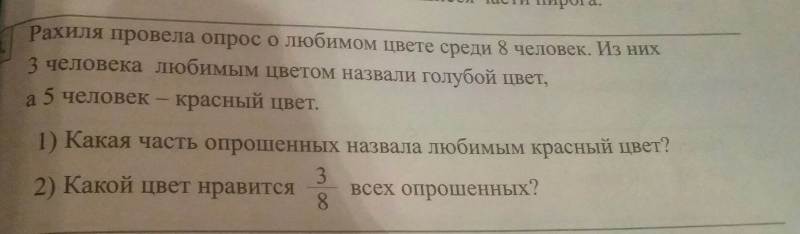 1) 5:8=5/8 опрошенных назвали любимым красный цвет