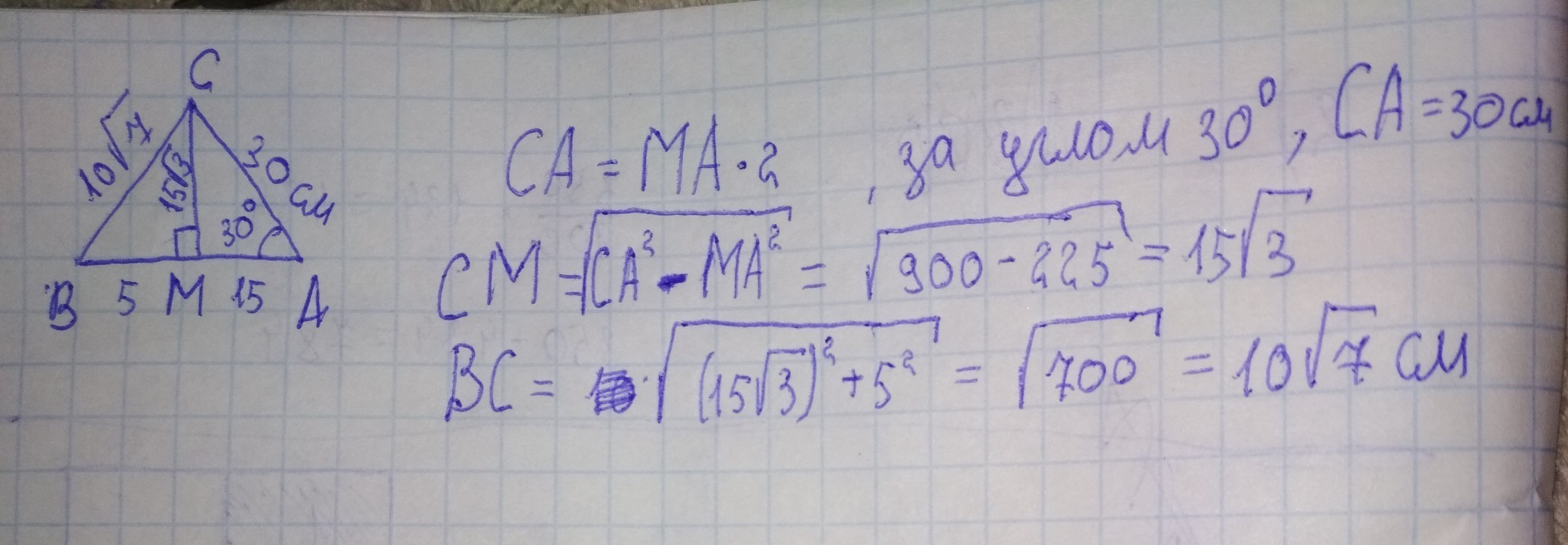 Высота СМ треугольника АВС делит его сторону АВ на отрезки АМ и ВМ. Найдите сторону ВС, если АМ=15см, ВМ=5см,углА=30градусов!Пж