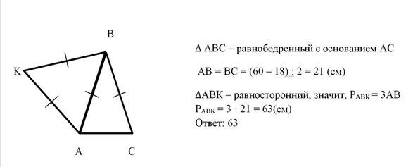 Боковая сторона равнобедренного треугольника ABC служит стороной равностороннего треугольника ABK. Периметр треугольника ABC равен 60 см, а его основание равно 18 см. Найдите периметр треугольника ABK.