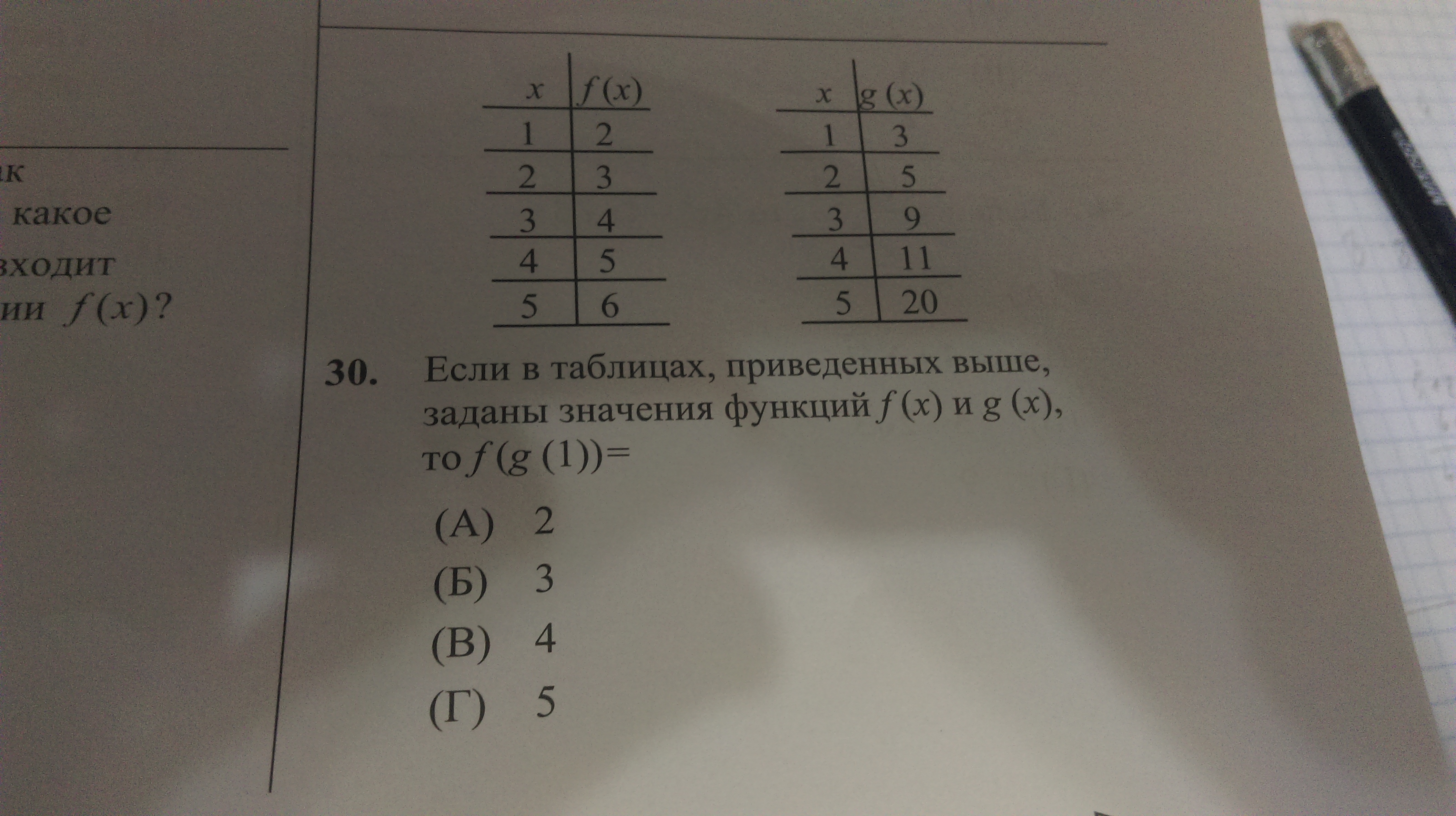 По правилу математики, если в выражении есть скобки, то начинаем всегда решать в скобках, т.е. сначала найдем g(1). Для этой функции аргумент равен 1. Ищем в таблице для функции g (вторая таблица) строку с аргументом, равным 1. Для этого значения аргумента значение функции g(1) равно 3 (первая строка второй таблицы).