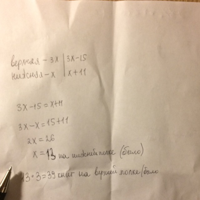 На верхней полке в 3 рза больше книг , чем на нижней .После таго , как с верхней полки сняли 15 книг , а на нижнюю добавили 11 книг , на обеих полках стало поровну. Сколько книг было на каждой полке первоначально