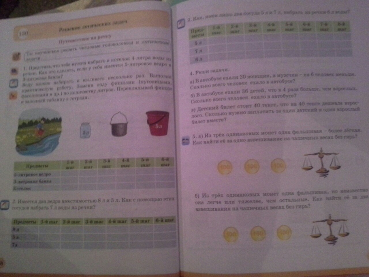 1. набираем в 5 л и переливаем в 3 литровую. то что осталось в ведре переливаем в котелок и так ещё раз