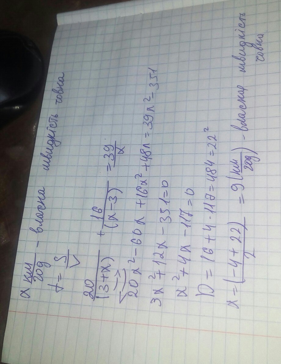 Човен пройшов 20 км за течією річки і 16 км проти течії, витративши стільки часу, скільки йому треба, щоб пройти 39 км у стоячій воді. Знайти власну швидкість човна, якщо швидкість течії дорівнює 3 км/год.