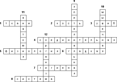 1. Совокупность клеток, которые имеют общее строение, происхождение и выполняют одну и ту же функцию.2. Основной элемент скелета позвоночных животных, образована костной тканью. В состав ее входят органические и неорганические вещества и вода.3. Повреждение тканей и органов тела без нарушения целостности кожи, сопровождающееся кровоизлиянием в глубоколежащие ткани.4. Группа тканей с общим происхождением и функцией, но имеющих разное строение.5. Наука, изучающая жизнедеятельность целостного организма и его частей – систем органов, тканей, клеток; выявляющая причины, механизмы и закономерности жизнедеятельности организма и взаимодействия его с окружающей средой.6. Мышца, состоящая из коротких волокон, содержащих одно ядро, не имеет поперечной исчерченности. Из этих волокон образованы стенки артерий и вен, почти весь пищеварительный тракт, желчный и мочевой пузыри. Сокращение этих мышц происходит автоматически, под влиянием внутренних рефлексов.7. Медицинская наука, изучающая влияние на здоровье человека внешней среды, в которой он живёт и трудится8. Совокупность тканей и органов, связанных общей функцией.9. Ткань, состоящая из клеток, плотно прилегающих друг к другу, и небольшого количества межклеточного вещества.10. Ткань, составляющая основную массу мышц, служит для приведения в движение всего организма и отдельных его органов.11. Наука, изучающая форму и строение отдельных органов, систем и организма в целом.12. Биологическая система отдельного живого существа. Целостная система, обладающая различными уровнями организации – одноклеточным и многоклеточным, который включает в себя уровень клеточный, тканевой, органный, системный и организменный.