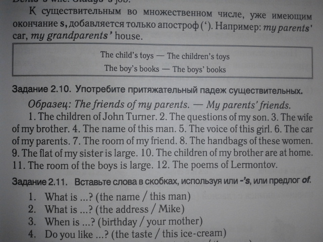 John Turner's children, my son's questions, my brother's wife, this man's name, this girl's voice, my parents' car, my friend's room, these women's handbags, my sister's flat is large, my brother's children are at home, The boys' room is large, Lermontov's poems