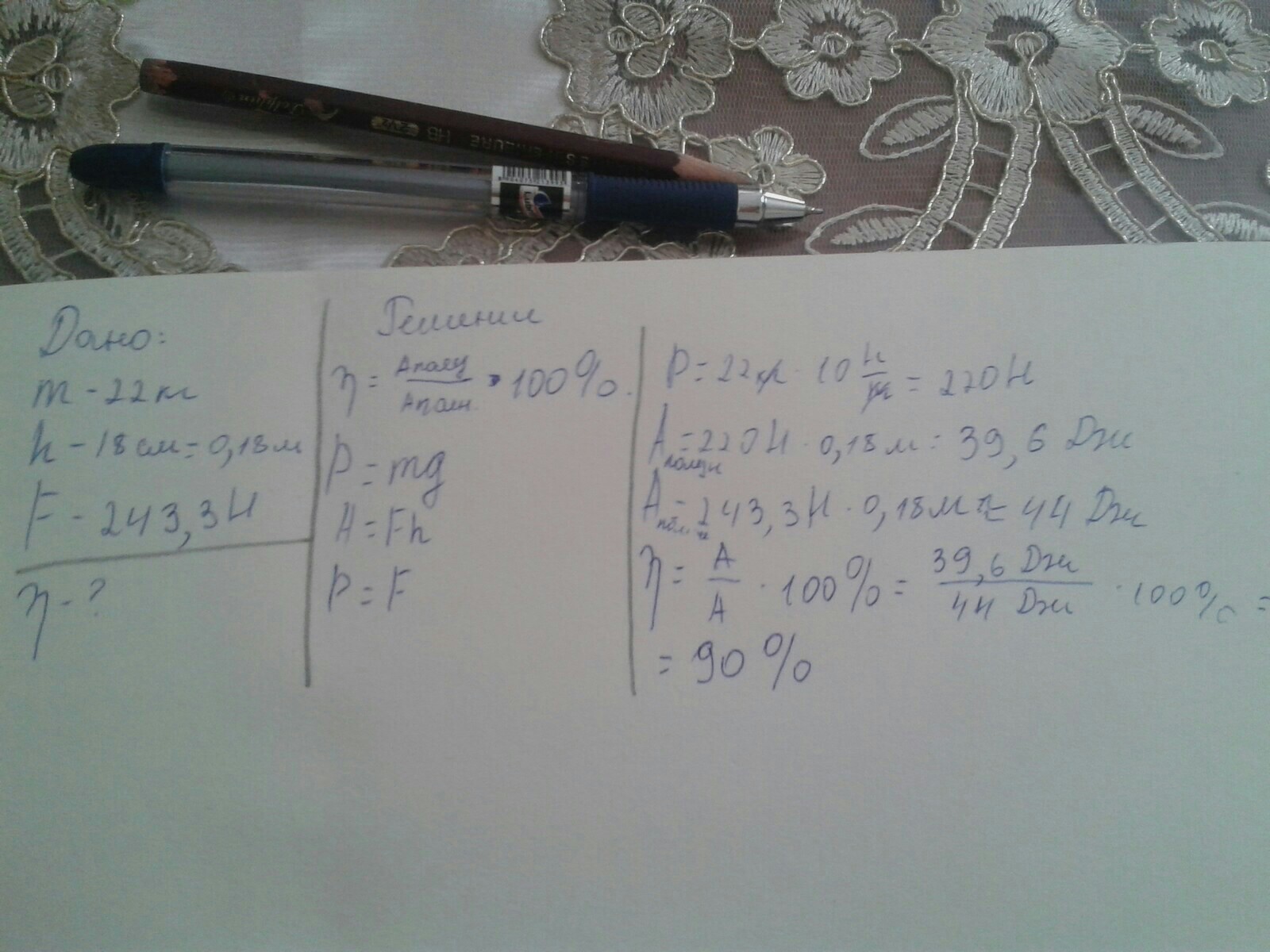 Ведро с раствором массой 22 кг поднимают при помощи неподвижного блока на высоту 18 с,действуя на веревку силой 234,3 Н. Вычислите КПД установки.