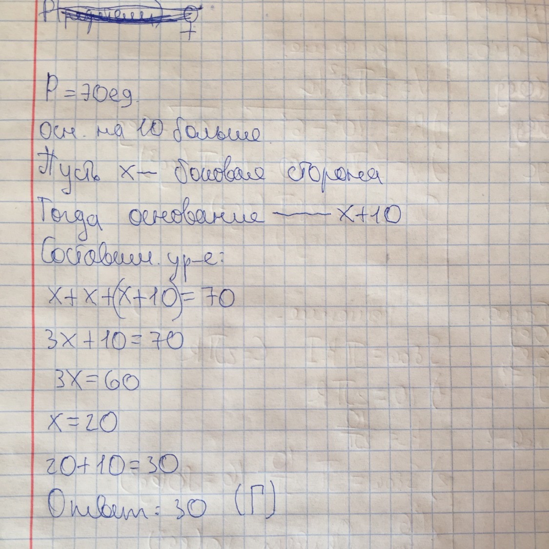 периметр равнобедренного треугольника равен 70, а его основание на 10 больше боковой стороны. Найдите основание треугольника А 10. Б 26 целых 2/3 В 20. Г 30.