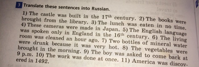 1) Замок был построен в 17 веке. 2) Книги взяли в библиотеке. 3) Ланч был съеден вовремя. 4) Эти камеры сделаны в Японии. 5) По-английски разговариаали только в Англии в 16 веке. 6) Гостиную убрали час назад. 7) Две бутылки минеральной воды выпили, потому что было очень жарко. 8) Овози взяли утром. 9) Мальчику сказали прийти домой в 9 часов вечера. 10) Работа была сделана. 11) Америка была открыта в 1492.
