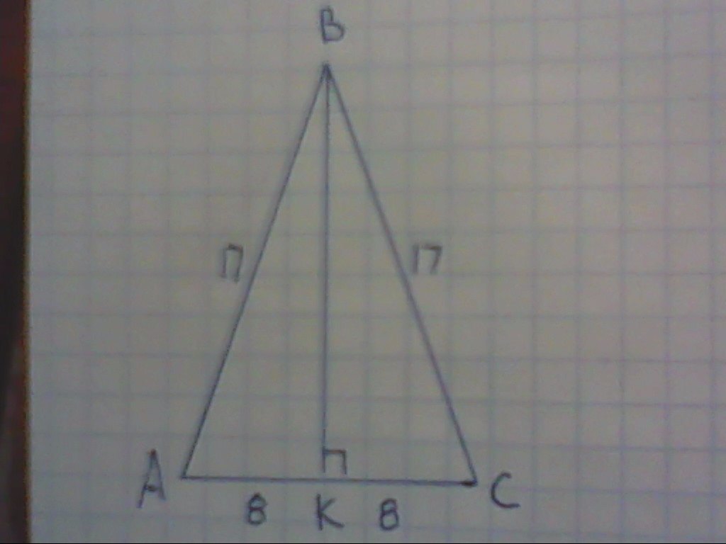 В равнобедренном треугольнике ABC боковые стороны равны 17,а основание равно 16. Чему равна высота треугольника