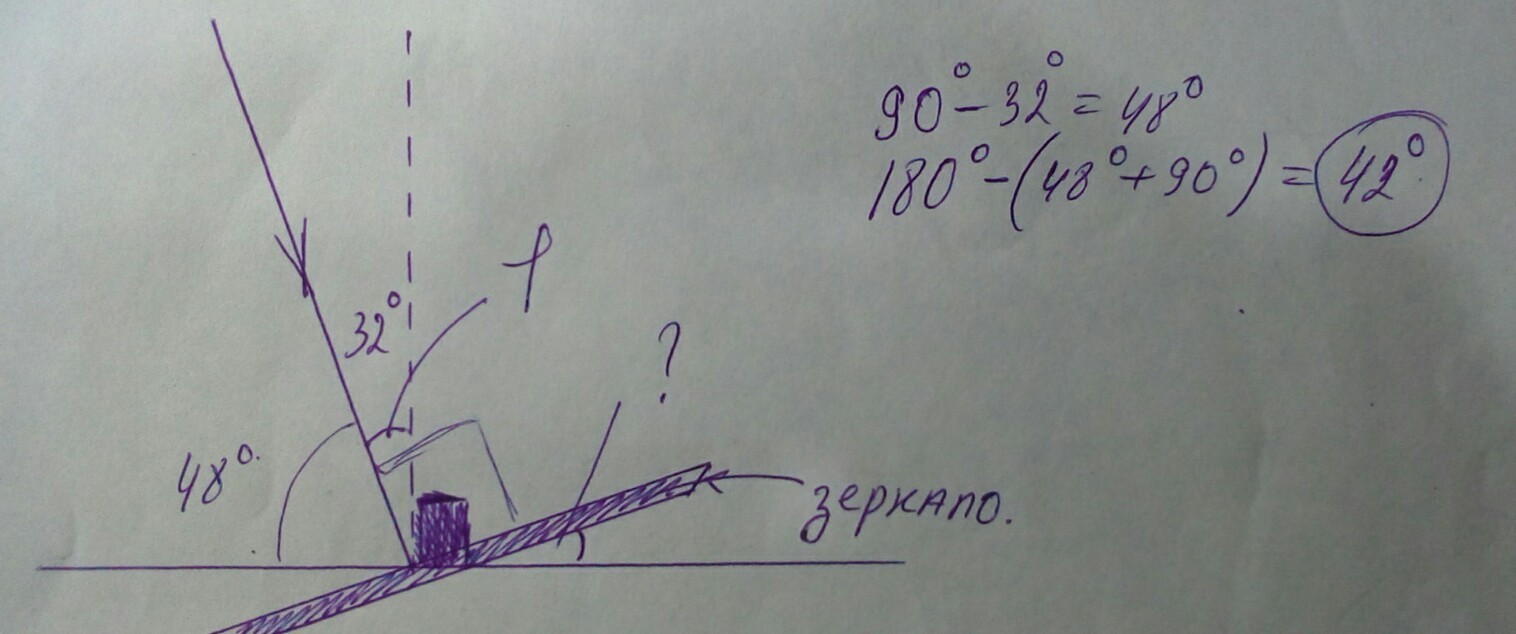 Солнечные лучи падают на землю под углом 32 градуса к ее поверхности. Под каким углом к гаризонту нужно расположить плоское зерколо, чтобы направить отраженные от него лучи вертекально вверх? Подробное решение, пожалуйста