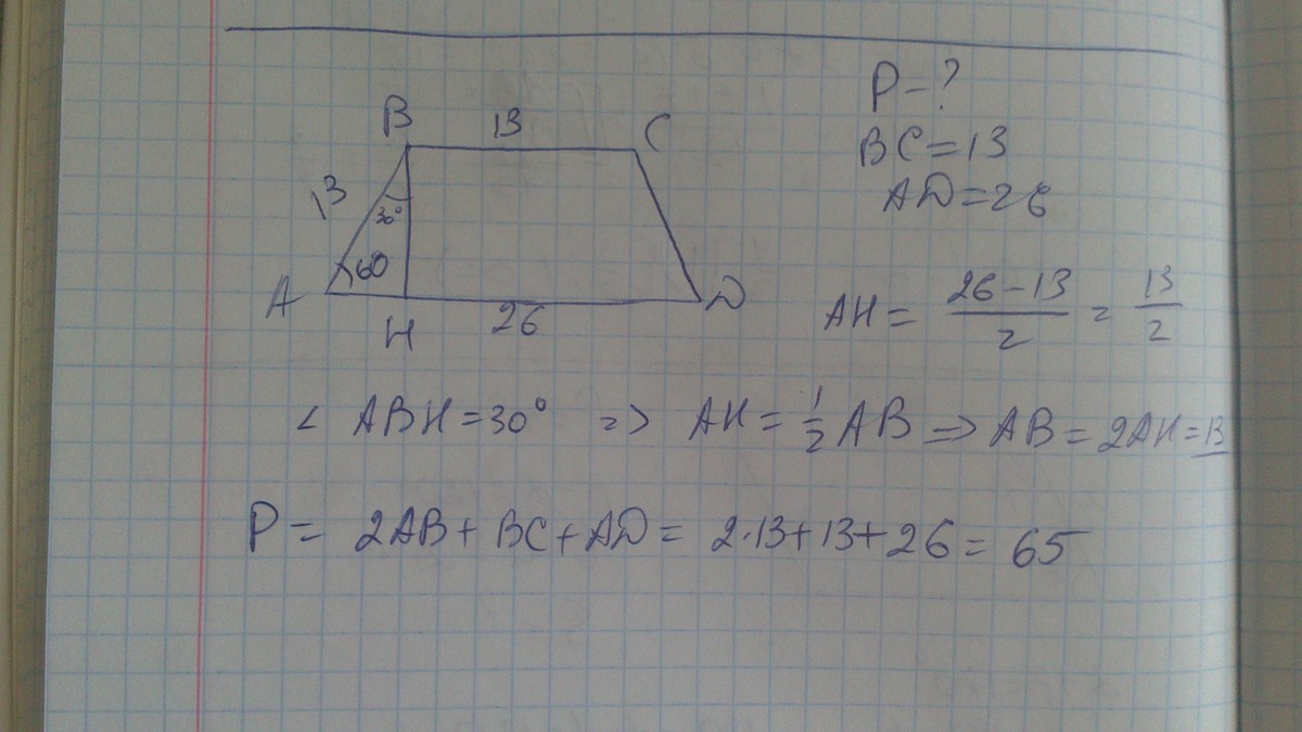 В равнобедренной трапеции основания равны 13 и 26, острый угол равен 60 градусов. Найдите ее периметр