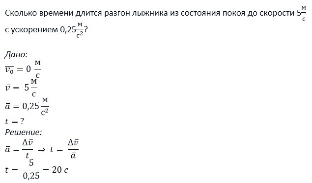 Сколько времени длится разгон лыжника из состояния покоя до скорости 5 м/с с ускорением 0,25 м/с2?