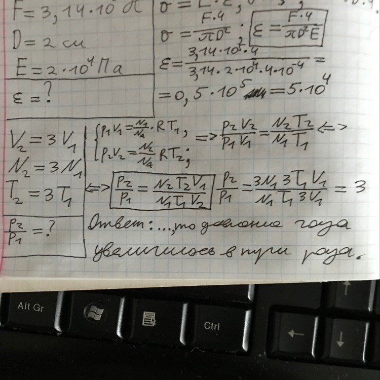 Объем газа увеличился в 3 раза, число молекул и температура также увеличились в 3 раза, то давление газа..