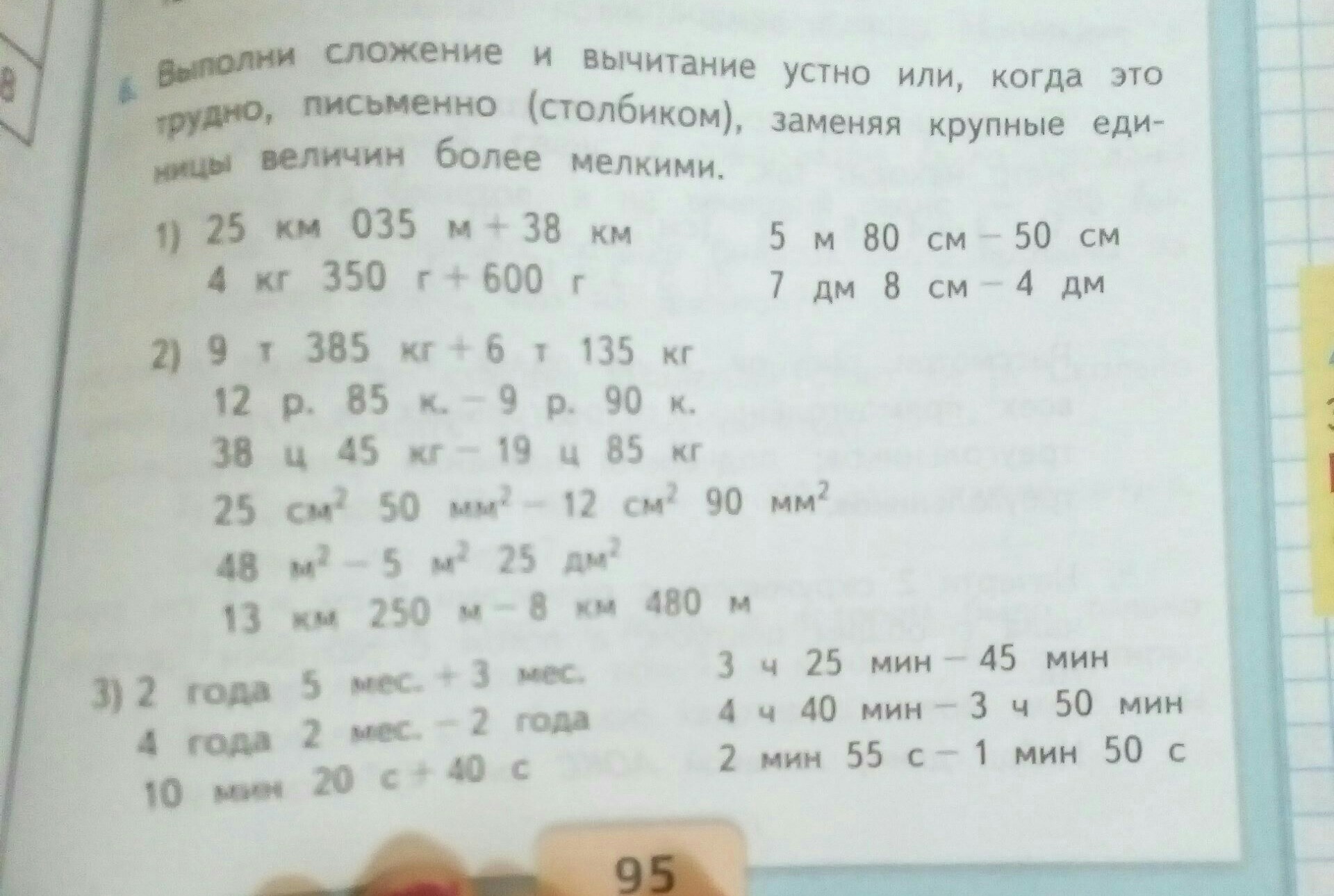 только 1) 25 км 035 м+38 м=63 км 035 м 4 кг 350+600 г=4 кг 950 г 5 м 80 см -50 см=5 м 30 см 7 дм 8 см -4 дм=3 дм 8см