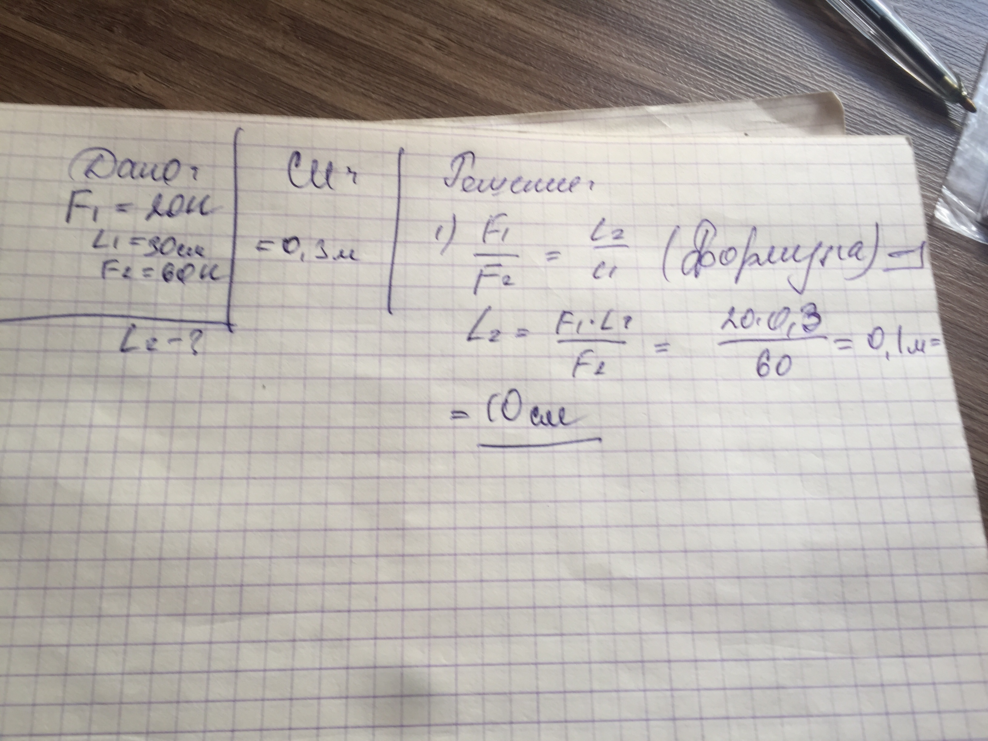 при равновесии рычага на его большее плечо, равное 30 см, действует сила 20 Н, а на меньшее-сила 60 Н. определите меньшее плечо рычага
