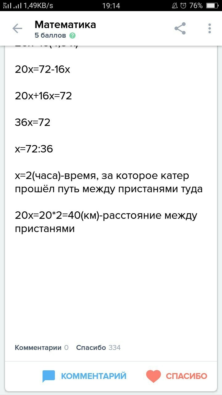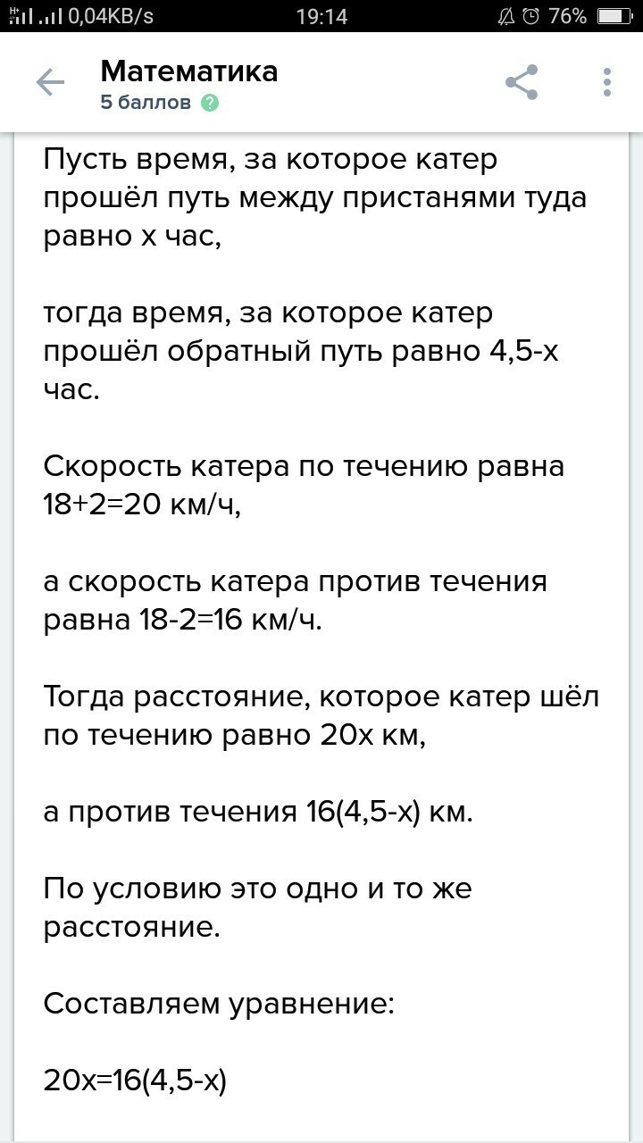 Помогите решить задачу катер прошел расстояние между пристанями туда и обратно за 4,5 часа. Скорость течения реки 2км ч, а собственная скорость катера 18 км ч. Найдите расстояние между пристанями. линейные уравнения с одной переменой ( Тема)