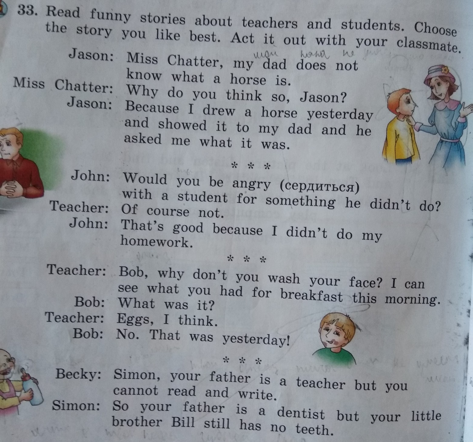 Учитель: Боб, почему ты не умываешь своё лицо? Я могу видеть что было у тебя на завтрак.