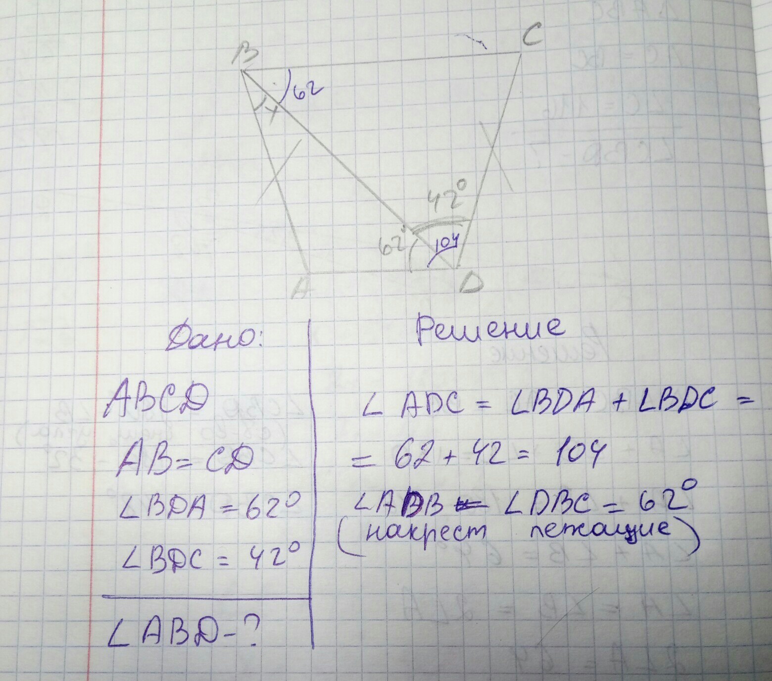 углы при основаниях у трапеции равны, поэтому угол A=D=104, у любого четырёхугольника есть свойство - сумма углов 360 градусов, поэтому отнимаем два угла (104*2) получаем 360-208=152, делим надвое, получаем 76 градусов, отнимаем твой угол (тот, который накрест лежащий) и получаем 76-62=14 градусов