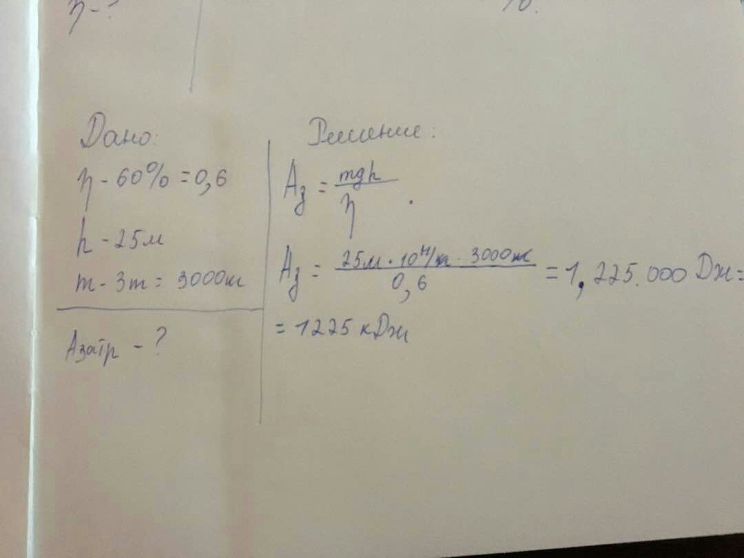 определите затраченное работу если помощью механизма КПД 60%на высоту 25 метров подняли груз массой 3 т