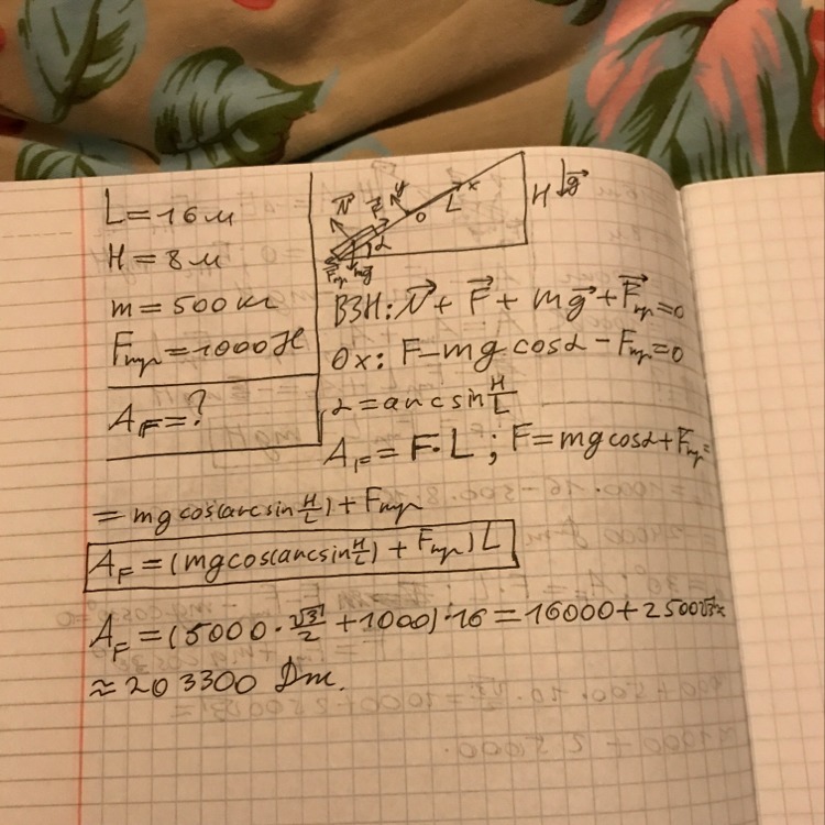 Срочно!!! По наклонной плоскости длиной 16 метров равномерно поднимается на высоту 8 метров тело массой 500кг вычислите работу активной силы если сила трения равна 1кН