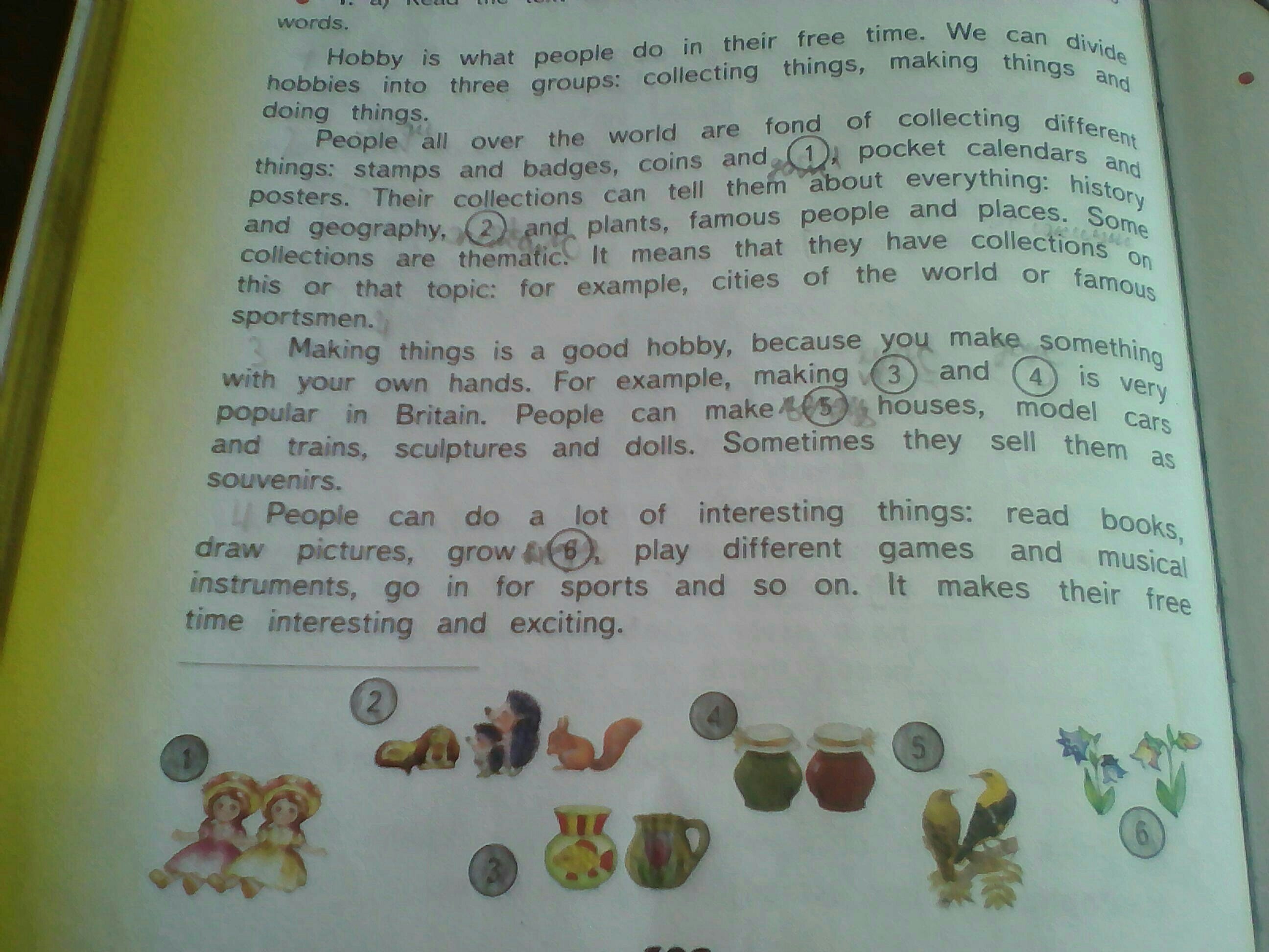 Хобби - это то, что люди делают в свободное время. Мы можем разделить хобби на три группы : коллекционирование вещей, создание вещей и делание вещей (здесь имеется в виду совершение каких-либо действий). Люди со всего света обожают коллекционировать различные вещи: марки и бейджи, монетки и куклы, карманные календарики и постеры. Их коллекции могут рассказать им обо всем : об истории и географии, о животных и растениях, о знаменитых людях и местах. Некоторые коллекции тематические. Это значит, что у людей есть коллекции по той или иной теме: например, города мира или знаменитые спортсмены. Создание вещей - это хорошее хобби, потому что ты можешь сделать что-то своими руками. Например, создавать вазы и горшки очень популярно в Великобритании. Люди могут делать дома для птиц, модели машинок и поездов, скульптуры и куклы. Иногда люди продают их как сувениры. Люди могут делать множество интересных вещей: читать книги, рисовать картинки, выращивать цветы , играть в различные игры и играть на музыкальных инструментах, заниматься спортом и так далее. Это делает их свободное время интересным и увлекательным.