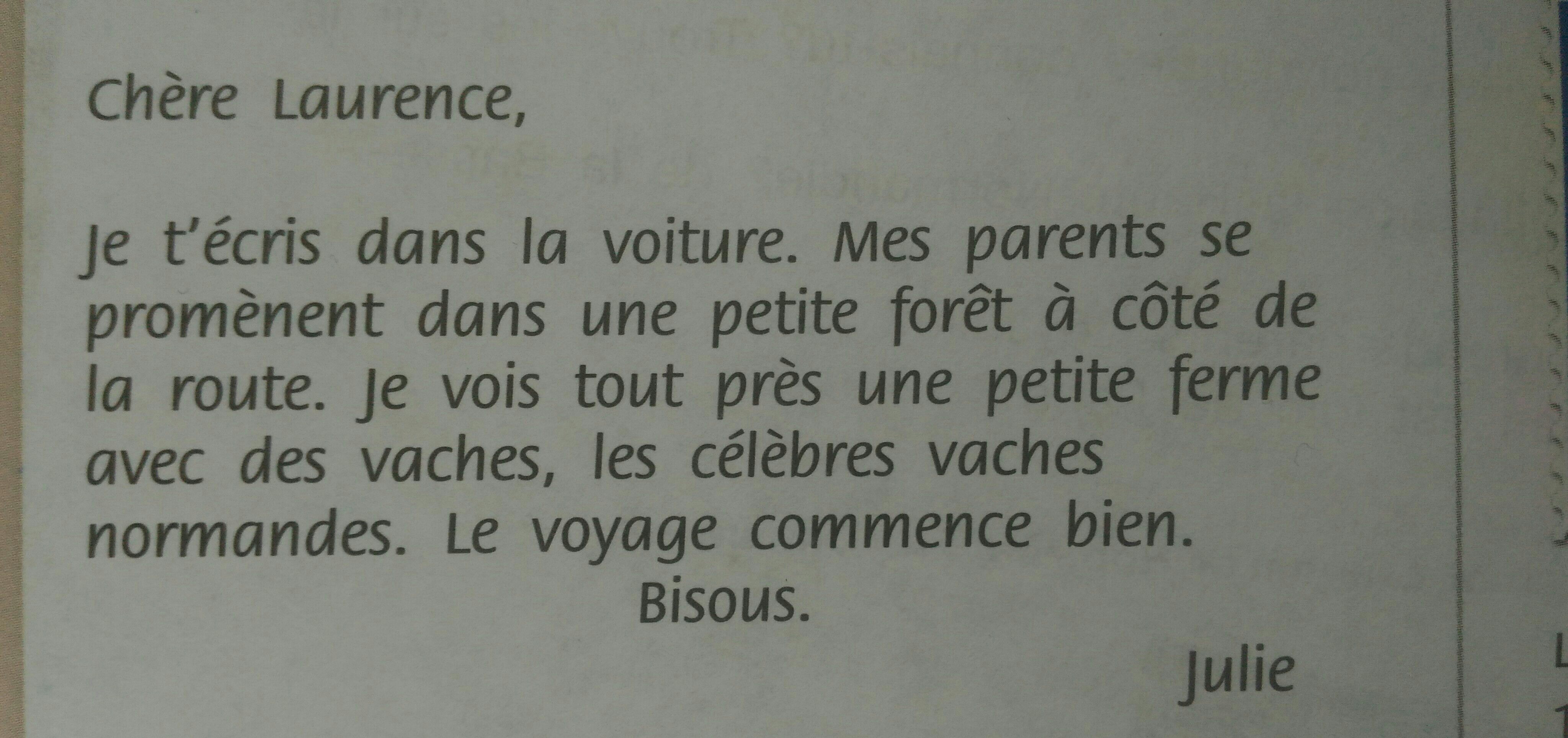 Дорогой Лоуренс, я пишу тебе в машине. Мои родители ходят в небольшом лесу рядом с дорогой. Я вижу небольшую ферму с коровами, знаменитыми нормандскими коровами. Путешествие начинается хорошо. (вот перевод)