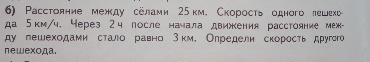 Первый пешеход прошел за 2 часа 10км. Весь путь 25км. Соответственно, 25-10-3(расстояние между пешеходами)=12км - путь второго пешехода за 2 часа. 12км/2часа=6 км/ч скорость второго пешехода
