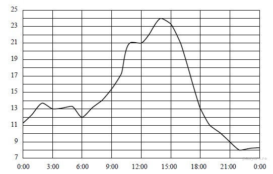На рисунке показано, как изменялась температура воздуха на протяжении одних суток. По горизонтали указано время суток, по вертикали — значение температуры в градусах Цельсия. Найдите разность между наименьшим и наибольшим значениями температуры. Ответ дайте в градусах Цельсия.