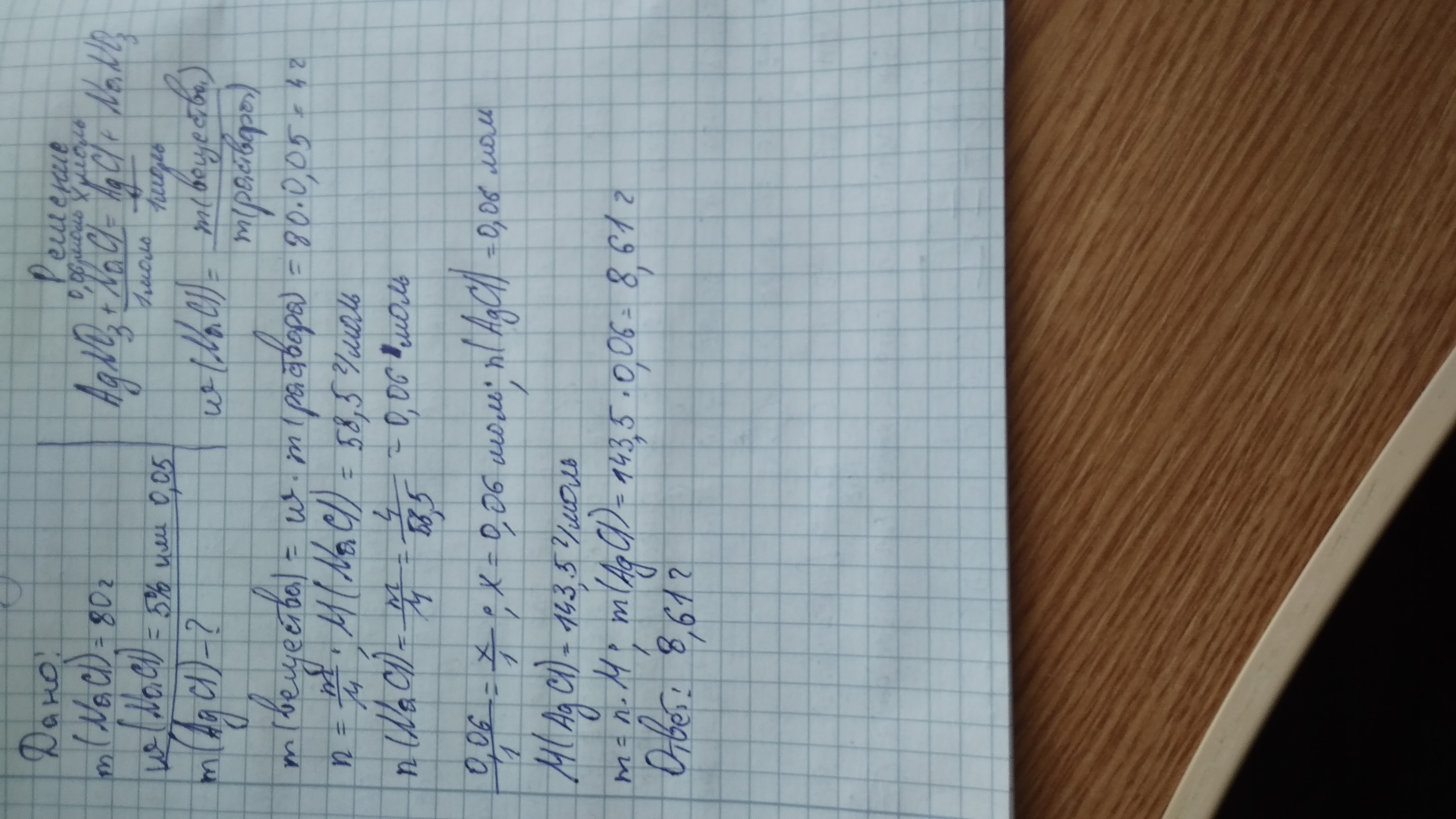 к 80 г раствора с массовой долей хлорида натрия 5% добавили избыток раствора нитрата серебра.