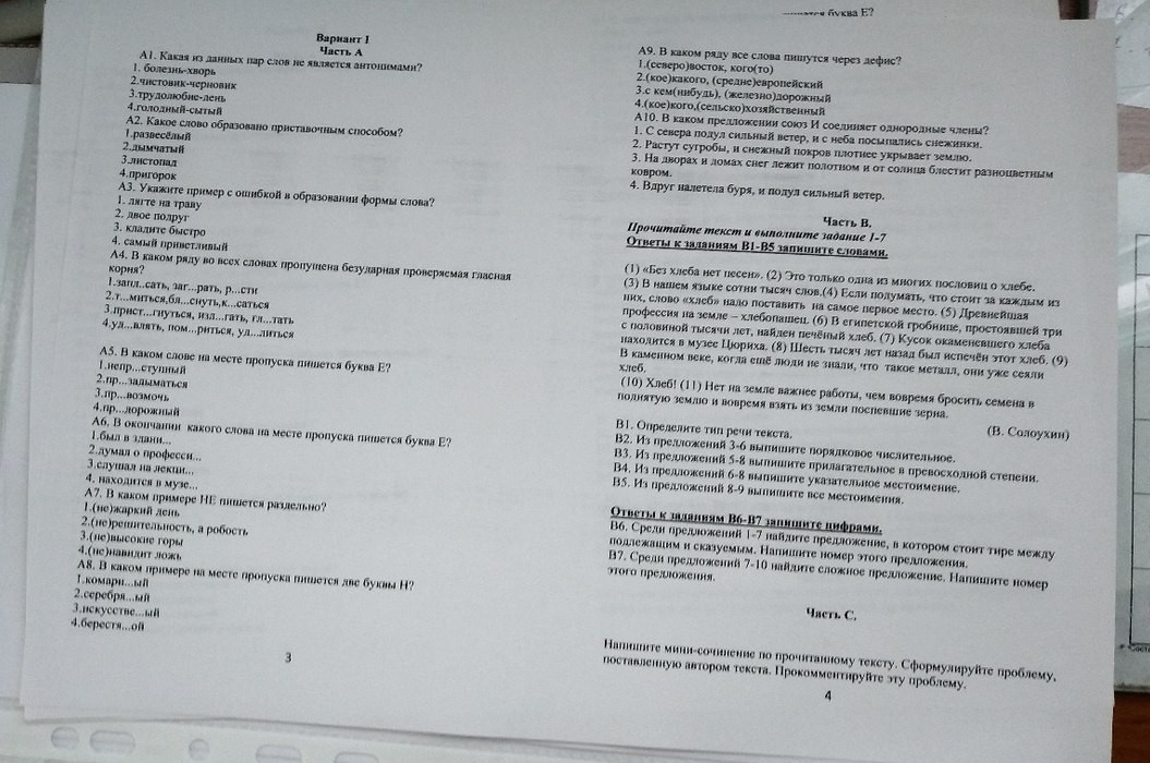 А1 болезнь -хворь А2 развесёлый А3 самый приветливый А4 удивляться помириться удилиться А5 непреступный А6 находится в музее А7 нерешительность а робость А8искусственный А9 кое-кого сельско-хозяйственный А10 ТРЕТИЙ В1рассуждение В2три с половиной тысячи лет В3окаменевшего В4 ? В5 этот ещё они В6 5 В7 9
