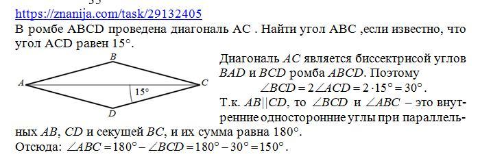 В ромбе ABCD проведена диагональ AC . Найти угол ABC ,если известно,что угол ACD равен 15 градусов
