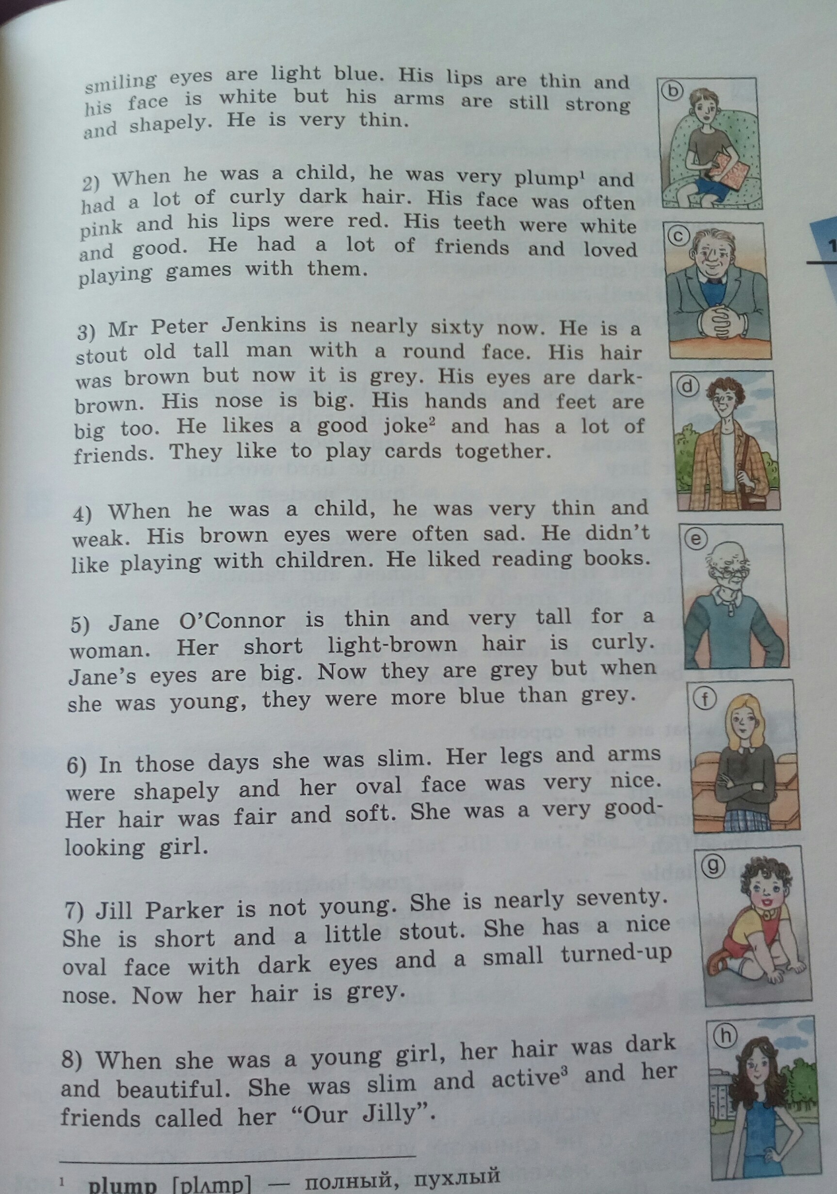 2) Когда он был ребенком, он был очень пухлым и имел много вьющихся темных волос. Его лицо часто розовое, а губы были красными. Его зубы были белее и хороши. У него было много друзей и они любили играть в игры с ними. 3) Мистер Питер Дженкинс сейчас почти шестьдесят. Он крепкий старик с круглым лицом. Его волосы были коричневыми, но теперь они серые. Его глаза темно-коричневые. Его нос большой. Его руки и ноги тоже большие. Ему нравится хорошая шутка и много друзей. Им нравится играть в карты вместе. 4) Когда он был ребенком, он был очень худым и слабым. Его карие глаза часто были грустными. Ему не нравилось играть с детьми. Ему нравилось читать книги 5) Джейн О'Коннор тонкая и очень высокая для женщины. Ее короткие светло-каштановые волосы курчавые. Глаза Джейн большие. Теперь они серые, но когда она была молода, они были более синими, чем серые. 6) В те дни она была стройной. Ее ноги и руки были стройными, а ее овальное лицо было очень красивым. Ее волосы были светлыми и мягкими. Она была очень красивой девушкой. 7) Джилл Паркер не молода. Ей почти семьдесят. Она короткая и немного толстая. У нее приятное овальное лицо с темными глазами и маленьким носом. Теперь ее волосы седые. 8) Когда она была молодой девушкой, ее волосы были темными и красивыми. Она была стройной и активной, и ее друзья называли ее «Наша Джилли».