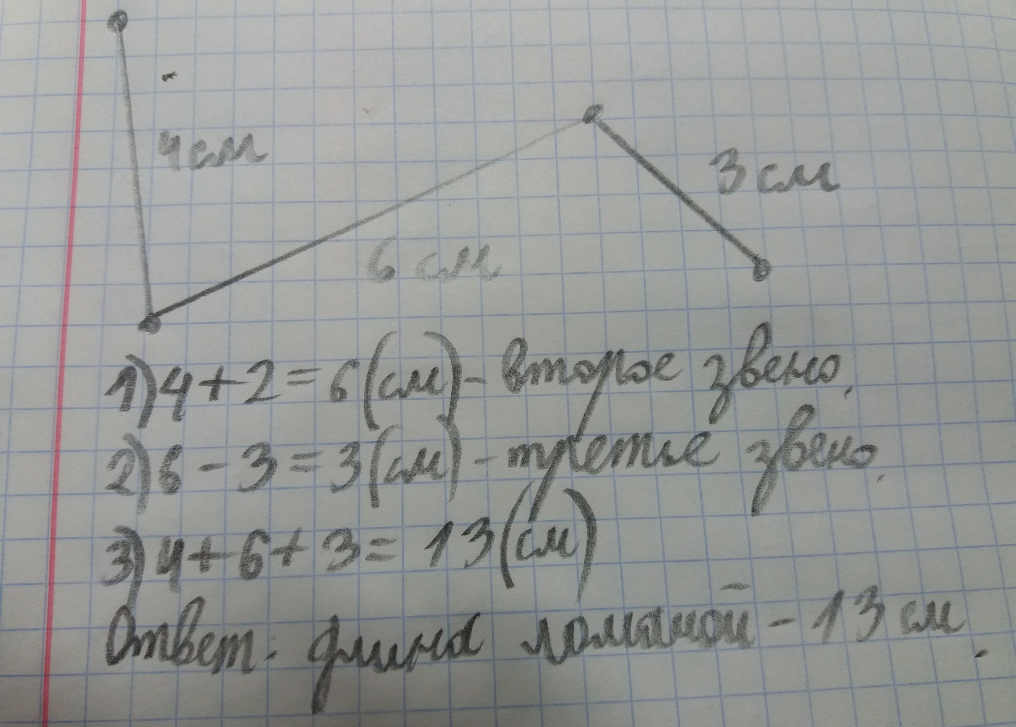 начерти ломаную из трех звеньев Длина одного звена 4 см,другого на -2 см больше.А третьего на -3 см меньше, Чем второго, вычисли длину ломаной
