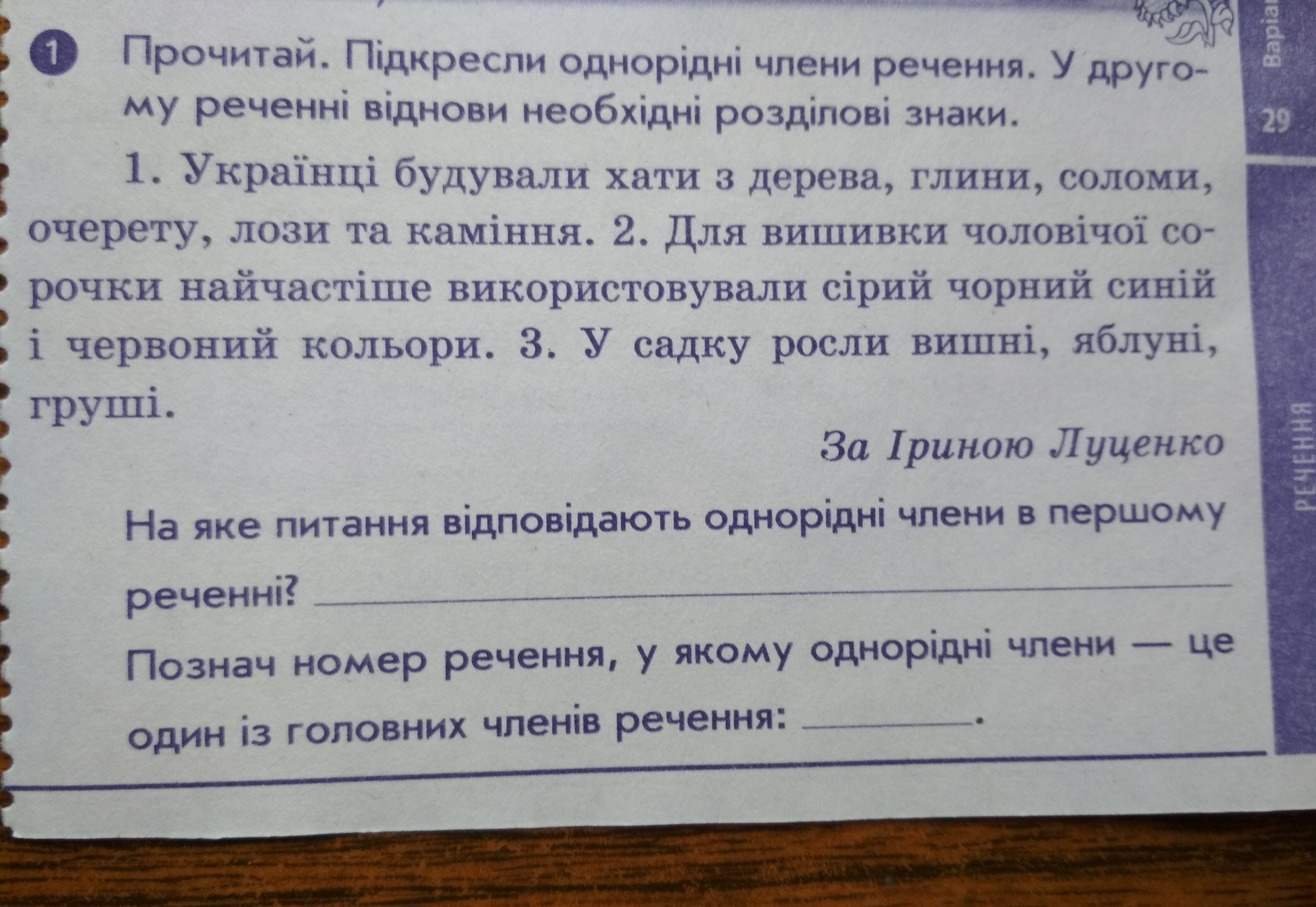 У садку росли (хто?) вишні , яблуні , груші . Будували з чого ? З дерева , глини , соломи , очерету , дози та каміння .