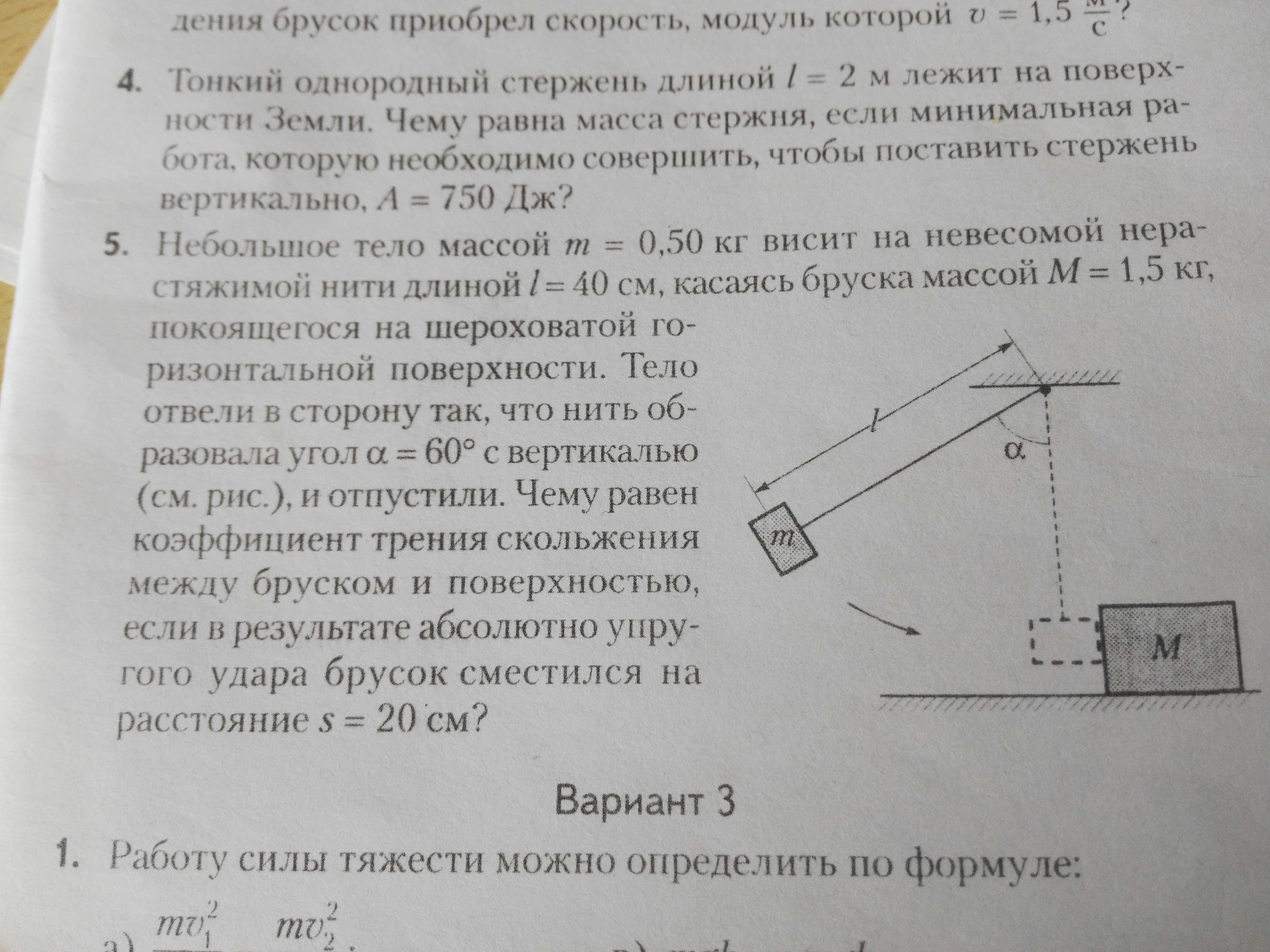 тело отвели на угол alphaтело поднялось на высоту h=L*(1-cos(alpha))тело приобрело потенциальную энергию mgh=mgL*(1-cos(alpha))тело отпустилипотенциальная энергия перешла в кинетическуюв момент контакта с бруском тело имело скорость vmgh=mv^2/2 - по закону сохр энергиивыражаем vv=корень(2*g*h)тело m имея скорость v столкнулось с неподвижным бруском массы М, в результате абс упругого столкновения тело получило скорость u=(m-M)*v/(m+M), (см комментарий ниже)а брусок получил скорость U=2*m*v/(m+M) (см комментарий ниже)******комментарий*******эти формулы можно вывести из ЗСИ и ЗСЭmv^2/2=mu^2/2+MU^2/2mv=mu+MU**************U=2*m*v/(m+M)подставляем v=корень(2*g*h)U=2*m*корень(2*g*h)/(m+M)возведем скорость в квадрат - пригодится позжеU^2=(2*g*h)*(2*m/(m+M))^2брусок двигался, кинетическую энергию затратил на преодоление силы трения A = F*S =мю*M*g*S = MU^2/2 (работа силы трения равна кинетической энергии бруска)выпишем последнее уравнениемю*M*g*S = MU^2/2 сократим М и выражаем мюмю = U^2/(2*g*S)подставляем U^2=(2*g*h)*(2*m/(m+M))^2мю = U^2/(2*g*S)= (2*g*h)*(2*m/(m+M))^2/(2*g*S)сокращаем на 2g числитель и знаменательмю = h*(2*m/(m+M))^2/Sподставляем h=L*(1-cos(alpha))мю =L*(1-cos(alpha))*(2*m/(m+M))^2/Sтеперь подставляем числа в си (в виде чтобы схавал эксель)мю =0,4*(1-cos(пи()/3))*(2*0,5/(0,5+1,5))^2/0,2 = копирую вот эту часть=0,4*(1-cos(пи()/3))*(2*0,5/(0,5+1,5))^2/0,2вставляю в эксельполучаю ответ0,25
