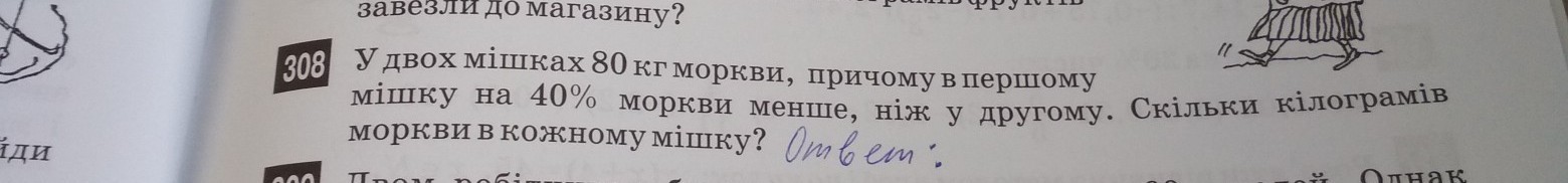 Пусть во 2-м мешке х кг моркови, тогда в 1-м - 0,6х (100%-40%=60%=0,6).