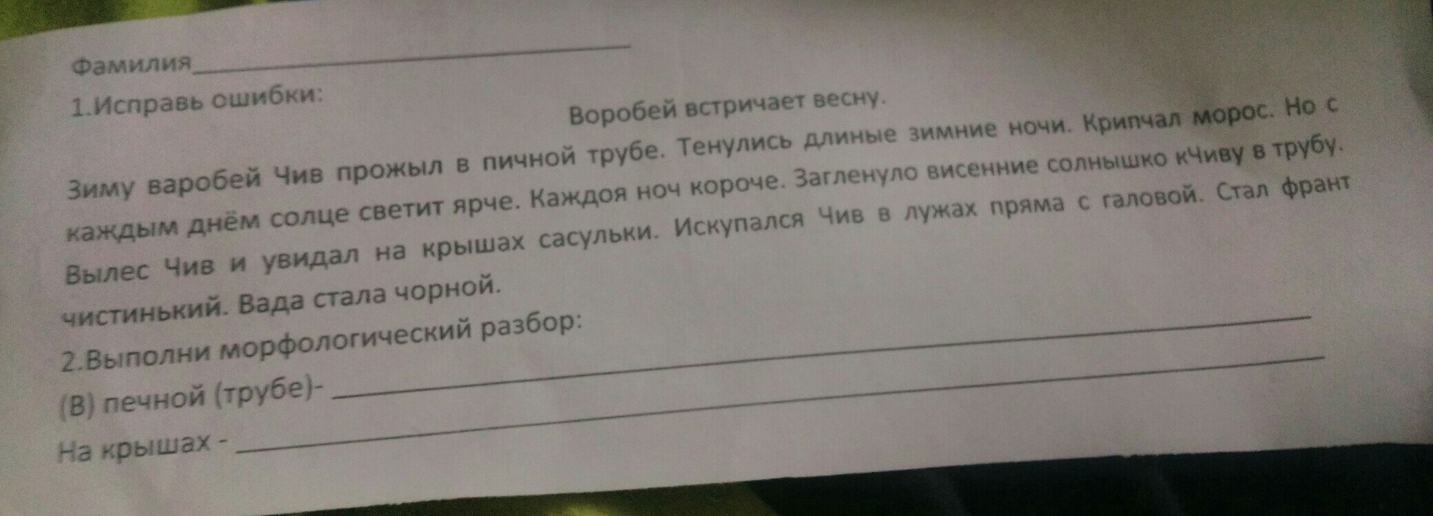 Зиму воробей Чив прожил в печной трубе. Тянулись длинные зимние ночи. Крепчал мороз. Но с каждым днём солнце светит ярче. Каждая ночь короче. Заглянуло весеннее солнышко к Чиву в трубу. Вылез Чив и увидал на крышах сосульки. Искупался Чив в лужах прямо с головой. Стал Франт чистенький. Вода стала чёрной.